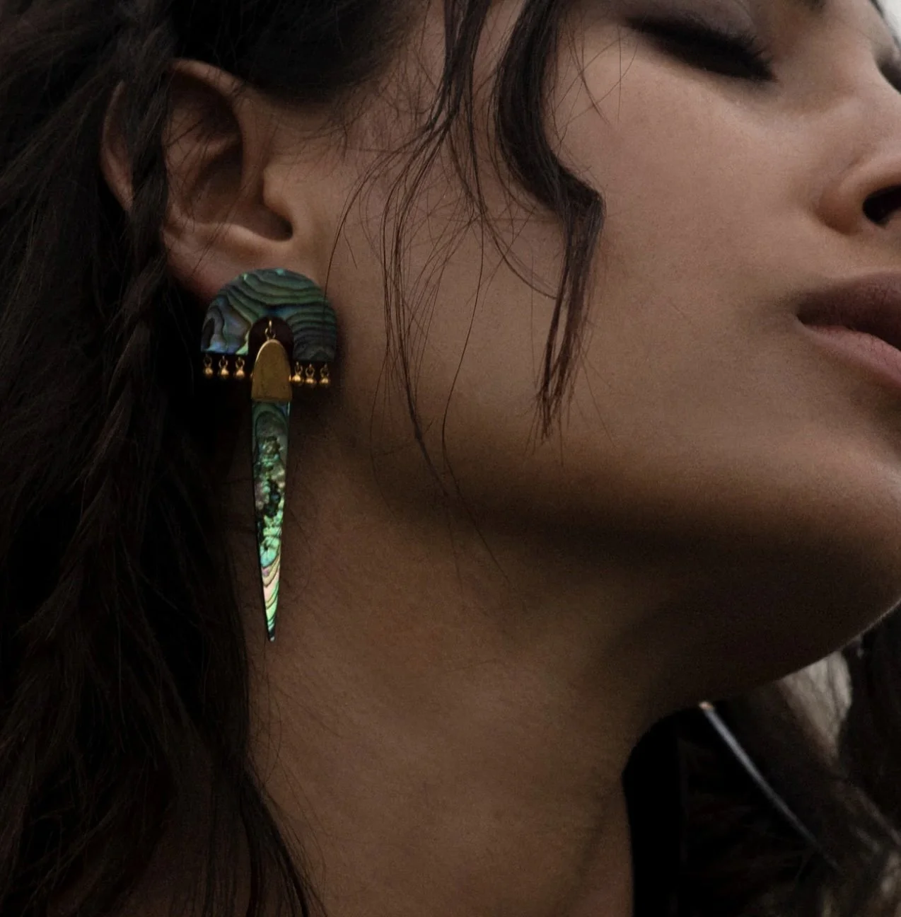 Using sterling silver and brass inlaid with mother of pearl and paua shell tiles creates sculptural jewellery which is beautifully lightweight and effortless to wear.